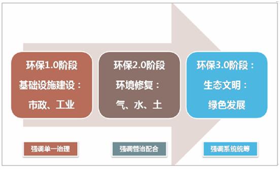 ? ? 根據(jù)環(huán)保行業(yè)發(fā)展歷程可將其大致劃分為三個(gè)階段,環(huán)保1.0階段,本階段伴隨中國(guó)城市化工業(yè)化進(jìn)程,以環(huán)保固定資產(chǎn)投資和基礎(chǔ)設(shè)施建設(shè)為主;環(huán)保2.0階段,則是2013年后,以“三個(gè)十條”為主的環(huán)境修復(fù)工作,強(qiáng)調(diào)監(jiān)管治理相互配合;而環(huán)保3.0階段,也就是“十九大”以后更傾向于將環(huán)保定義為一種綠色的發(fā)展方式:將綠色融入中國(guó)未來(lái)發(fā)展,同時(shí)將環(huán)保作為促進(jìn)中國(guó)經(jīng)濟(jì)轉(zhuǎn)型、推動(dòng)產(chǎn)業(yè)升級(jí)的核心力量。